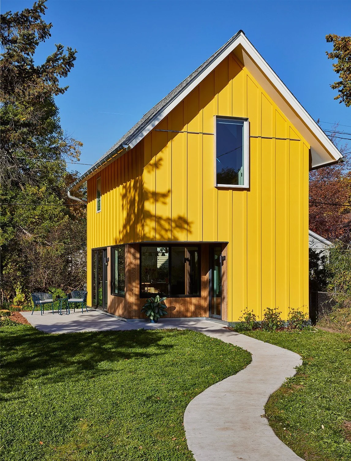 A key feature of Sunflower is its lack of a garage. By foregoing a garage, both levels of the ADU can be used for living space. The first floor has the entertaining spaces, including the kitchen and living room. In contrast to “typical” Minnesotan ADUs, which have a garage on the main level, this layout allows for direct access to the garden from the living spaces. Upstairs are the bedroom, bathroom, and laundry. An exposed glulam beam (a structural beam made of layers of wood) is used to support the roof while adding warmth to the upper level.